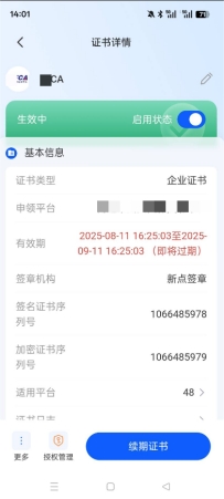 6.用户前往“证书管理”界面,证书有效期自动更新。