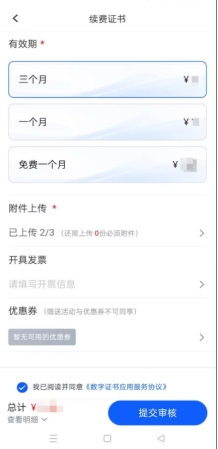 4.点击【续期证书】按钮,选择有效期并上传相关附件,完善页面内容后点击【提交审核】,等待CA审核。